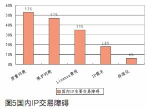 根據(jù)我們對(duì)92家芯片設(shè)計(jì)企業(yè)的問(wèn)卷調(diào)查,IP質(zhì)量、IP保護(hù)和IP費(fèi)用是目前國(guó)內(nèi)IP核交易中的主要障礙。(見(jiàn)圖5)