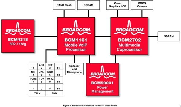 該方法的一個例子如圖1所示。該方案支持接入到本地?zé)o線網(wǎng)絡(luò)的Wi-Fi 接口上的全雙工語音和視頻,它已經(jīng)有了成功的實(shí)現(xiàn)案例,并計劃用于一款新型的消費(fèi)產(chǎn)品設(shè)計。所有高級的呼叫建立和管理、音視頻同步以及應(yīng)用層都在一片BCM1161 VoIP器件上運(yùn)行。為實(shí)現(xiàn)這些功能采用了一片嵌入式通用ARM926E RISC CPU,還有一片嵌入式DSP用于音視頻編解碼和回波消除。利用一個BCM4318E 802.11b/g Wi-Fi無線網(wǎng)絡(luò)接口,BCM1161提供了為實(shí)現(xiàn)一個具有成本效益的Wi-Fi手機(jī)的語音所需的全部功能。