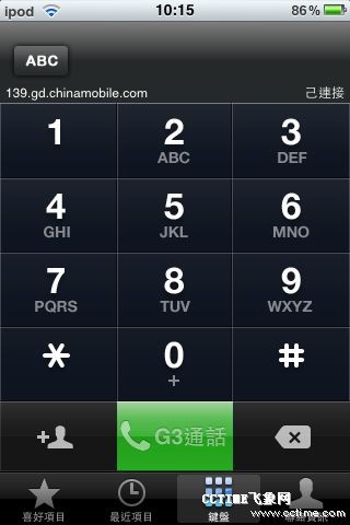 “G3通話”客戶端的用戶界面與iPhone撥號界面極為相似,并標(biāo)注有139.gd.chinamobile.com的網(wǎng)址,不過目前該網(wǎng)址無法進(jìn)入。該客戶端可提取系統(tǒng)自身聯(lián)系人列表,方便用戶撥打網(wǎng)絡(luò)電話。通話界面也與iOS4中的通話界面完全相同。