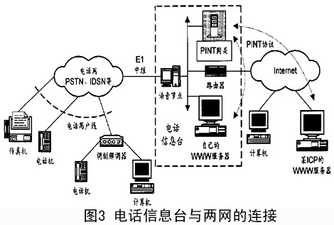---- 由 于PINT 業(yè) 務(wù) 主 要 是 以WWW 方 式 實(shí) 現(xiàn) 的, 因 此 電 話 信 息 臺 就 應(yīng) 與ICP 合 作, 如 圖3, 在 兩 者 之 間 以 一 種 標(biāo) 準(zhǔn) 的 協(xié) 議 交 換 信 令 和 承 載 數(shù) 據(jù),PINT 協(xié) 議 正 是 一 種 很 合 適 的 協(xié) 議。 為 了 實(shí) 現(xiàn) 點(diǎn) 擊 撥 號、 點(diǎn) 擊 發(fā) 送 傳 真 等 業(yè) 務(wù), 需 要 在WWW 服 務(wù) 器 的 頁 面 上 嵌 入 激 活 這 些 業(yè) 務(wù) 的 鏈 接 項(xiàng), 鏈 接 項(xiàng) 對 應(yīng) 的 后 臺 程 序 是 一 個(gè)PINT 客 戶 端 程 序(PINT Client),PINT 網(wǎng) 關(guān) 中 也 具 有PINT Client 的 功 能。PINT Client 包 含 了UAC 和UAS 的 功 能。 在 這 類 業(yè) 務(wù) 的 推 廣 初 期, 由 于PINT 網(wǎng) 關(guān) 較 少, 作 為WWW 服 務(wù) 器 后 臺 程 序 的PINT Client 可 直 接 與PINT 網(wǎng) 關(guān) 交 互。 當(dāng) 業(yè) 務(wù) 使 用 規(guī) 模 進(jìn) 一 步 擴(kuò) 大 后 就 需 要 在Internet 中 設(shè) 置PINT Server, 各PINT Client 借 助 于 這 些PINT Server 來 找 到 一 個(gè) 合 適 的PINT 網(wǎng) 關(guān)。 如 果 電 話 信 息 臺 自 身 提 供 了ICP 的 功 能, 那 么 在 信 息 臺 內(nèi) 部 的 局 域 網(wǎng) 上 就 可 以 方 便 地 實(shí) 現(xiàn) 業(yè) 務(wù)。