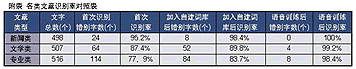 然后,我們又利用聲龍?zhí)赜械脑~匯生成器,讓聲龍自行辨別文章中的詞匯并自動(dòng)添加到自建詞庫(kù)中,并針對(duì)其中的一些英文單詞或縮寫(xiě)對(duì)聲龍進(jìn)行語(yǔ)音識(shí)別訓(xùn)練,之后我們?cè)俅武浫胪黄獙?zhuān)業(yè)文章。結(jié)果非常令人滿意,從附表可以看出識(shí)別率有了明顯提高。最后,我們又錄入了另一篇相同領(lǐng)域的專(zhuān)業(yè)文章中的一段(512字)。首次錄入的錯(cuò)別字有46個(gè),識(shí)別正確率為91%。與第一篇文章相比,識(shí)別率有了明顯提高。