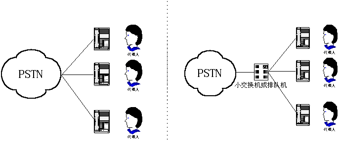 呼叫中心,早期是指一個(gè)由兩人或更多人組成的、在一個(gè)特定地方用專用設(shè)備處理電話業(yè)務(wù)的小組。這些人就是通常所說的呼叫中心代理(人)。一個(gè)呼叫中心可以只提供信息接收服務(wù),或者只提供信息發(fā)送服務(wù),或者是一個(gè)混合式呼叫中心,其呼叫中心代理會負(fù)責(zé)所有這兩項(xiàng)工作。從物理設(shè)備構(gòu)成來看,第一代呼叫中心可用下圖(1)、(2)表示。