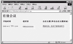 如果在前面已設(shè)置了提醒功能,那么在臨近會(huì)議前屏幕上將出現(xiàn)提醒窗口。教師機(jī)和學(xué)生機(jī)有三種方法可以參加會(huì)議:點(diǎn)擊提醒窗口中[參加會(huì)議]按鈕;或者不等提醒,直接點(diǎn)擊會(huì)議邀請(qǐng)函中的鏈接打開會(huì)議網(wǎng)頁;最好的方式還是打開IE,輸入網(wǎng)址http://x/conferencing/list.asp進(jìn)入會(huì)議(x為Exchange服務(wù)器的IP地址或計(jì)算機(jī)名),如圖3。