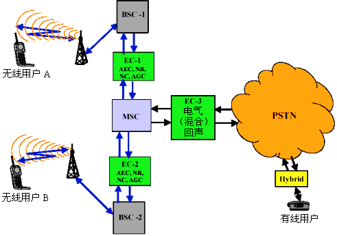 由于電回聲來自2線/4線混合組件,只有對于"移動到PSTN"(公共電話網(wǎng)絡(luò))的連接來說,才需要用到EEC功能。同樣,由于聲學(xué)回聲,對于"移動到移動"呼叫來說(也受益于"移動到PSTN"應(yīng)用),VQE更加重要。GSM和CDMA/TDMA從兩個不同的方面,處理了該事宜,請參見下面的介紹。