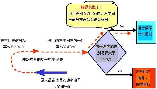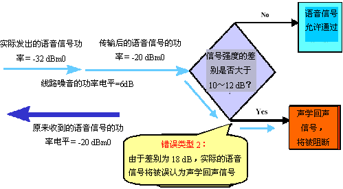 當通信鏈路的的另一端被設計為傳輸可變強度的信號時,"錯誤類型1"的影響會急劇增大。在這種情況下,根據功率電平的絕對差異來決定阻斷/允許信號的聲學回聲控制器會增大"錯誤類型1"出現的可能性。也就是說,使用絕對功率電平差異時,將聲學回聲信號誤認為有效語音信號的概率很大。