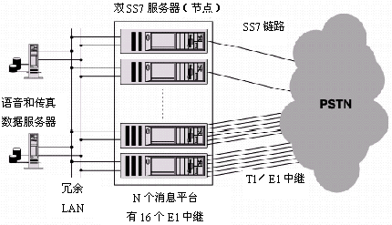 那兩個SS7節(jié)點是以冗余方式配置的,共享相同的信令點編碼,為所有的媒體節(jié)點提供呼叫控制。圖中所示的所有SS7鏈路采用單信令點編碼冗余方式備份,即使其中一個 SS7節(jié)點出現(xiàn)故障,信令系統(tǒng)仍能繼續(xù)為呼入提供不中斷的語音信箱訪問。