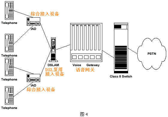 圖4給出了BLES的邏輯結(jié)構(gòu)。這種方式下,VoDSL廠商必須設(shè)計(jì)開(kāi)發(fā)用于和已有的用戶設(shè)備、DSL網(wǎng)絡(luò)及Class 5交換機(jī)互通的接口設(shè)備;用戶側(cè)設(shè)備IAD為數(shù)據(jù)傳輸提供了Ethernet和ATM接口,為話音傳送提供了一定數(shù)量的模擬用戶線接口,每一接口都被分配了唯一的DSL電路。話音網(wǎng)關(guān)和Class 5交換機(jī)間的接口協(xié)議,在美國(guó)等地區(qū)采用GR-303和TR-08標(biāo)準(zhǔn),而在歐洲標(biāo)準(zhǔn)中使用V5.2接口。參見(jiàn)后面的圖6。
