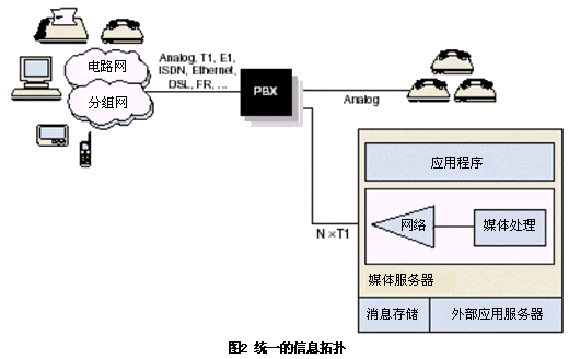 圖2是有前提的典型統(tǒng)一消息拓?fù)鋱D。這個例子中媒體服務(wù)器管理消息的存儲和提取,這些消息包括語音、傳真、數(shù)據(jù)或視頻。它可以訪問不同媒體文件以及必要的控制規(guī)則以實現(xiàn)各類媒體業(yè)務(wù)。可以在本地的媒體服務(wù)器上也可以在遠(yuǎn)程的集中存儲系統(tǒng)上進(jìn)行存儲。在這種情況下,能提供語音和傳真資源的統(tǒng)一的消息系統(tǒng)通常和email系統(tǒng)比如微軟的Microsoft