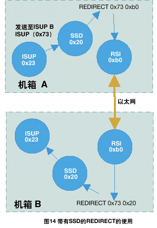 運行在信令卡上的協(xié)議模塊,接收端(對方)的REDIRECT語句應(yīng)該通過ssd或ssds驅(qū)動(通常情況下module_id為0x20)來對訊息進(jìn)行重定向,如圖14所示。