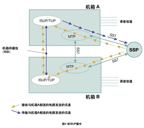 一個雙ISUP/TUP系統(tǒng)通過激活每個機箱中的一半電路協(xié)議狀態(tài)機進(jìn)行工作。每個ISUP/TUP層通過本地MTP3發(fā)送所有的傳送流量。本地MTP3采用與相鄰SS7節(jié)點之間的本地鏈路進(jìn)行傳輸,如果該鏈路發(fā)生故障,則采用機箱之間的SS7鏈路。