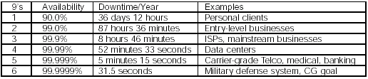 正如表中建議的那樣,實用性尤其在非常接近1的區(qū)間內(nèi)才被討論。盡管99%的正常運(yùn)行時間看起來很好,它仍然將導(dǎo)致每年超過3天半的故障時間。大部分方案不會被認(rèn)為是高可用的,直到它們接近99.9%的運(yùn)行時間--大概每年9個小時的故障時間。但是,通信行業(yè)使用4個9級別到5個9級別范圍的實用性。
