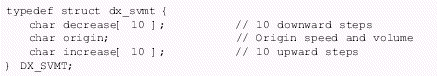 。。速度/音量條件塊(DX_SVCB)數(shù)據(jù)結(jié)構(gòu)用于詳細(xì)說(shuō)明一個(gè)播放文件的調(diào)節(jié)條件,根據(jù)這個(gè)條件,可以在重放前或者重放過(guò)程中按照用戶輸入的數(shù)字調(diào)節(jié)速度或者音量。